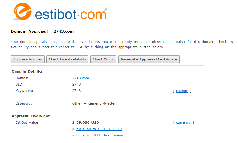 You can find that one common keyword domain great.com only value $750,000 USD. When I click the domain 2743.com, I get a value of $3,9000.