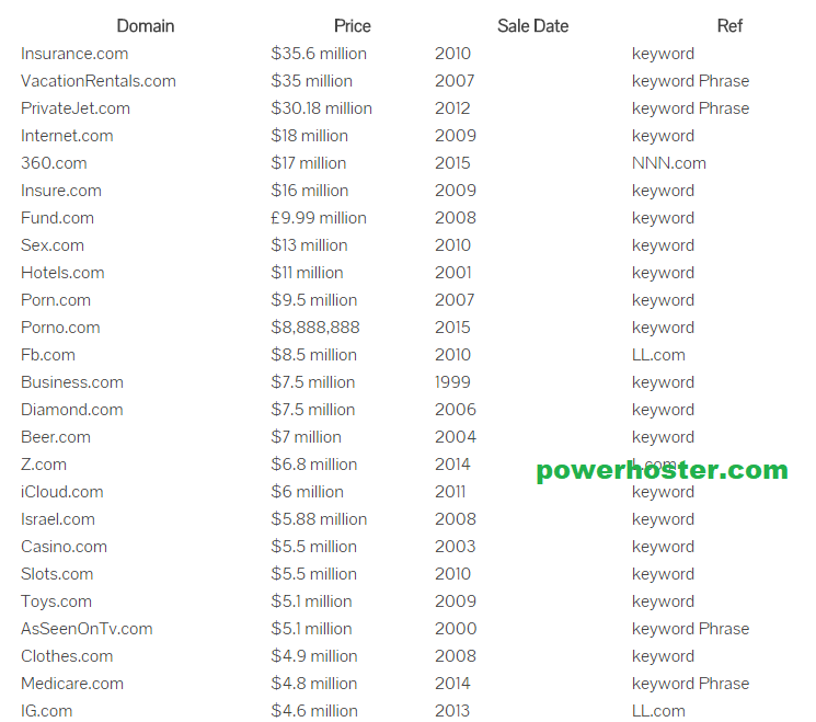 The most expensive domain names ever sold as above tables. Sex.com worths $13 million and porn.com worth $9 millions. . Insurance.com sold for $35.6 million six years ago. Internet.com sold for $18 million. Hotels.com sold for $11 million. Of course, those are all keyword or keyword phrases domain. Then you have things like 360.com selling for $17 million, IG.com for $4.6 million, and of course Facebook buying FB.com for $8.5 million. Before Facebook, who would have thought the random letters f and b in a domain would be worth so much?