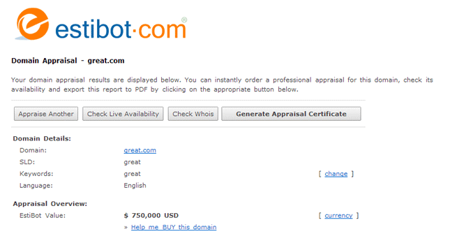 Online domain valuation tools are only to be used for research purposes, and should not serve as the final buying or selling price. If nothing else, domain valuation website such as Estibot, Valuate, and Website Outlook are useful in determining the difference between keyword and website appraisal values.