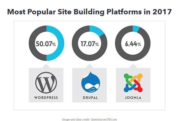 WordPress is only a blog platform at the beginning but now it is the most powerful website building platforms with thousands of beautiful themes and effective plugins. Best of all, almost all plugins and themes are free software. In 2017, WordPress occupies almost half website building platforms.