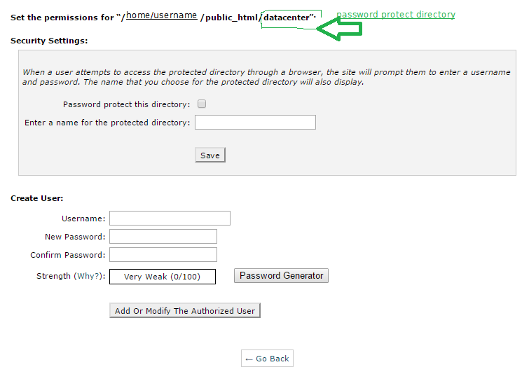 In the following example, you have password protected the “datacenter” directory. You need check “password protect this directoy” and enter a name for the protected directory. ( It is the line “The Member Zone Name” in your .htaccess file ). The you just need enter your username and password. The cpanel will do all the other procedurs for you.